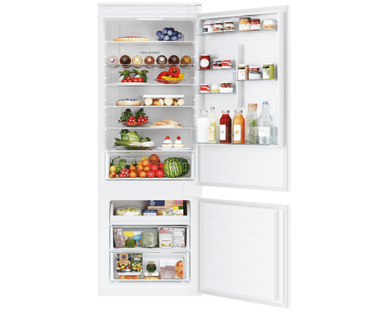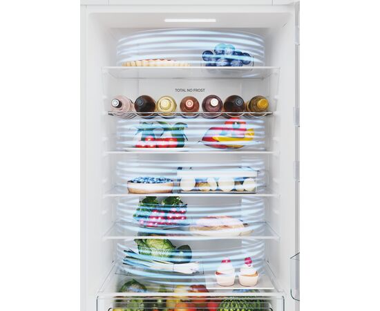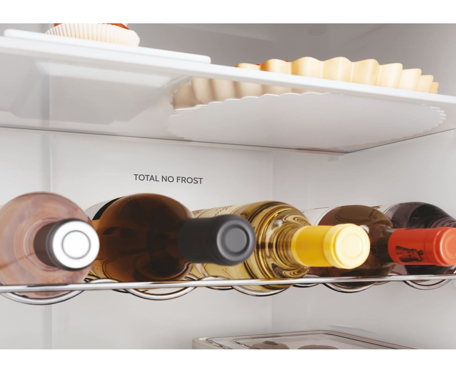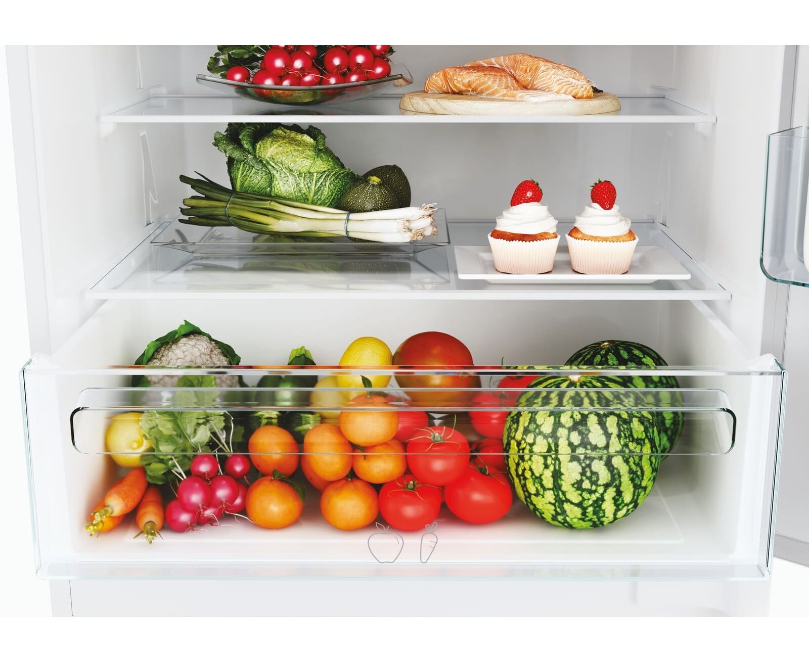 Lodówka wyposażona jest w pięć półek i pięć balkoników na drzwiach, które można dostosować do różnych rodzajów żywności. Specjalny pojemnik na warzywa i owoce zapewnia ich długotrwałą świeżość. Uchwyt na butelki gwarantuje stabilne przechowywanie napojów, minimalizując ryzyko przewrócenia.