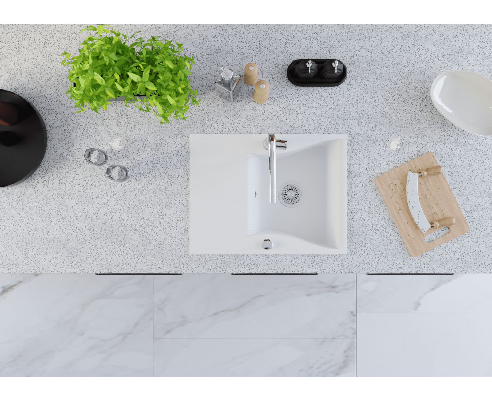 Zlewozmywak granitowy KERNAU KGS O 4565 1B1D Pure White łączy ponadczasową estetykę z wysoką funkcjonalnością. Wytrzymały kompozyt granitowy cechuje się odpornością na zarysowania, uderzenia i szok termiczny, dzięki czemu świetnie znosi codzienne użytkowanie. Wykończenie Pure White podkreśla nowoczesny charakter kuchni, a ergonomiczna geometria komory ułatwia pracę z dużymi naczyniami i blachami piekarnika.