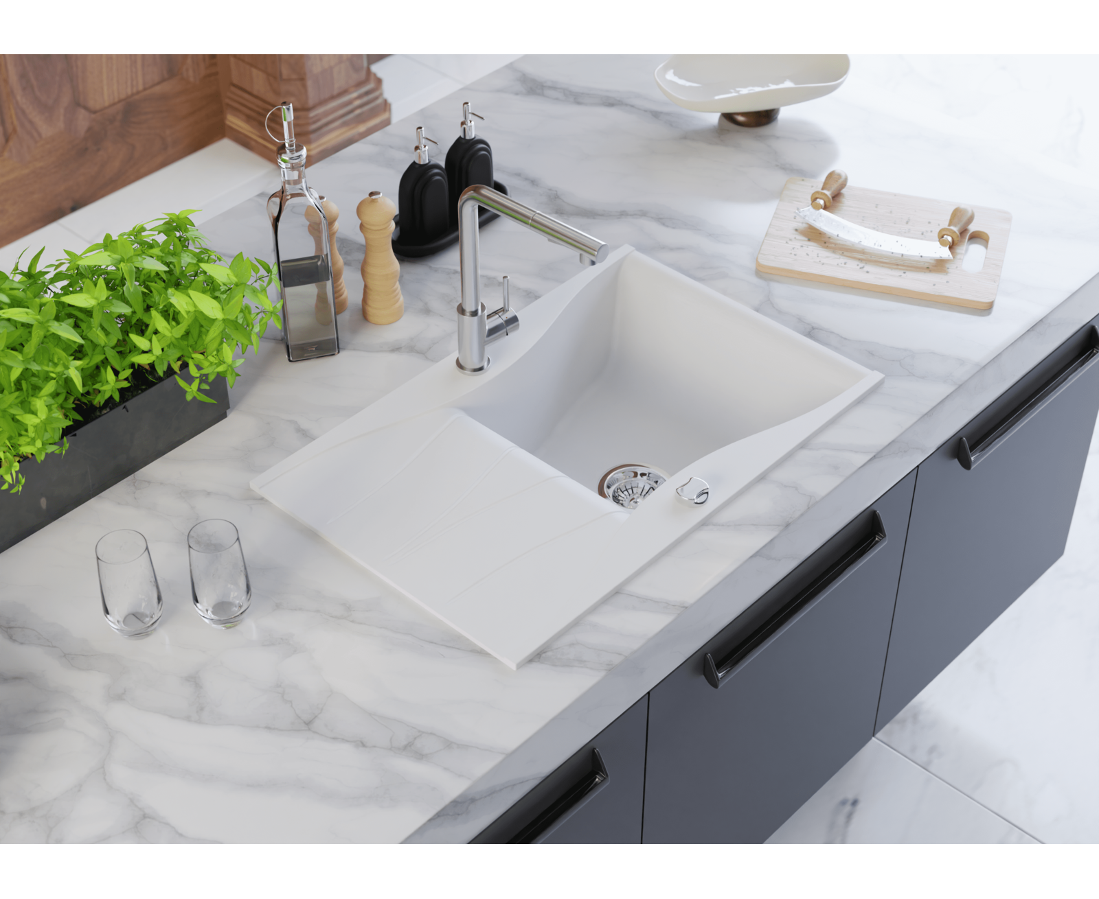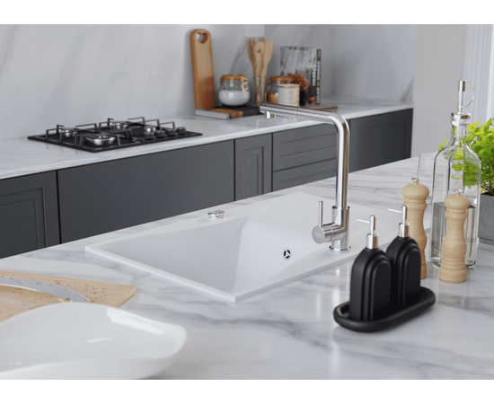 - Uniwersalne wzornictwo – pasuje do blatów laminowanych, konglomeratowych i kamiennych