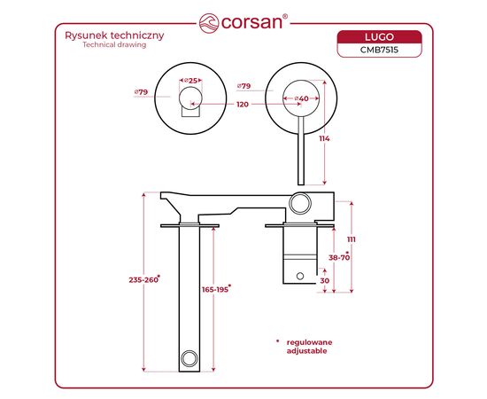 CORSAN CMB7515BGL - Bateria umywalkowa podtynkowa LUGO CMB7515BGL z wylewką Złoto Szczotkowane.
