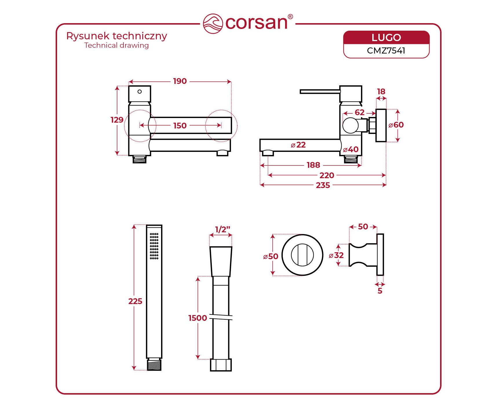 CORSAN CMZ7541BL - Bateria wannowa ścienna Corsan Lugo CMZ7541BL z zestawem natryskowym czarna.