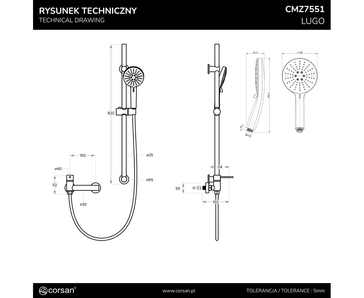CORSAN CMZ7551GL - Zestaw prysznicowy z baterią LUGO CMZ7551GL Złoty.