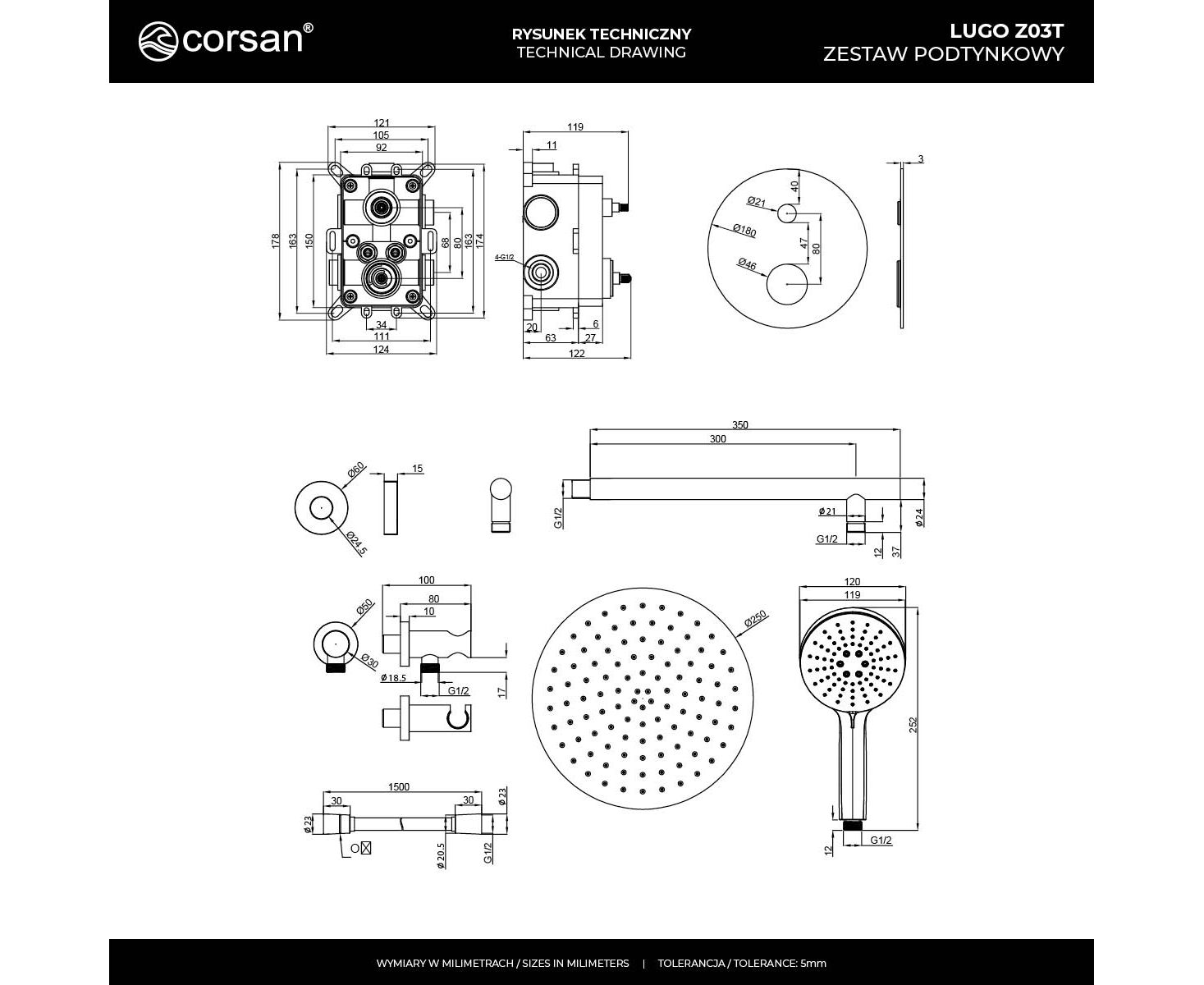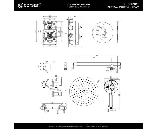 CORSAN Z03TBGL - Zestaw prysznicowy podtynkowy LUGO Z03TBGL Deszczownica 25cm Termostat Słuchawka prysznicowa Złoto szczotkowane.