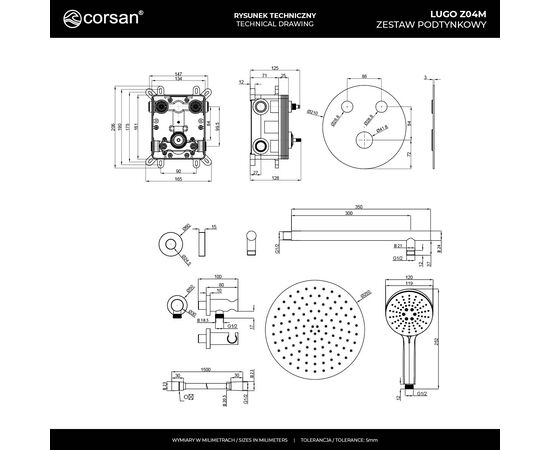 CORSAN Z04MBGL - Zestaw prysznicowy LUGO Z04MBGL Deszczownica 25cm Mieszacz Słuchawka prysznicowa Złoto szczotkowane.