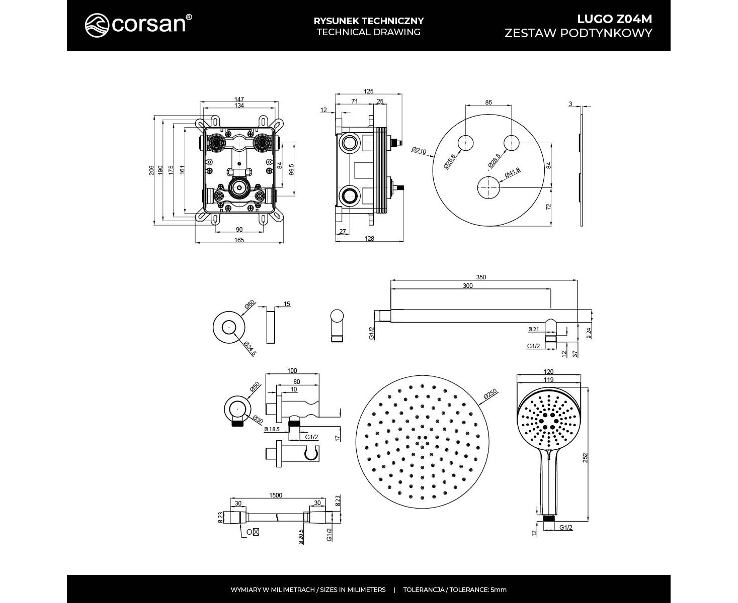CORSAN Z04MCH - Zestaw prysznicowy podtynkowy LUGO Z04MCH Deszczownica 25cm Mieszacz Słuchawka prysznicowa Chrom.