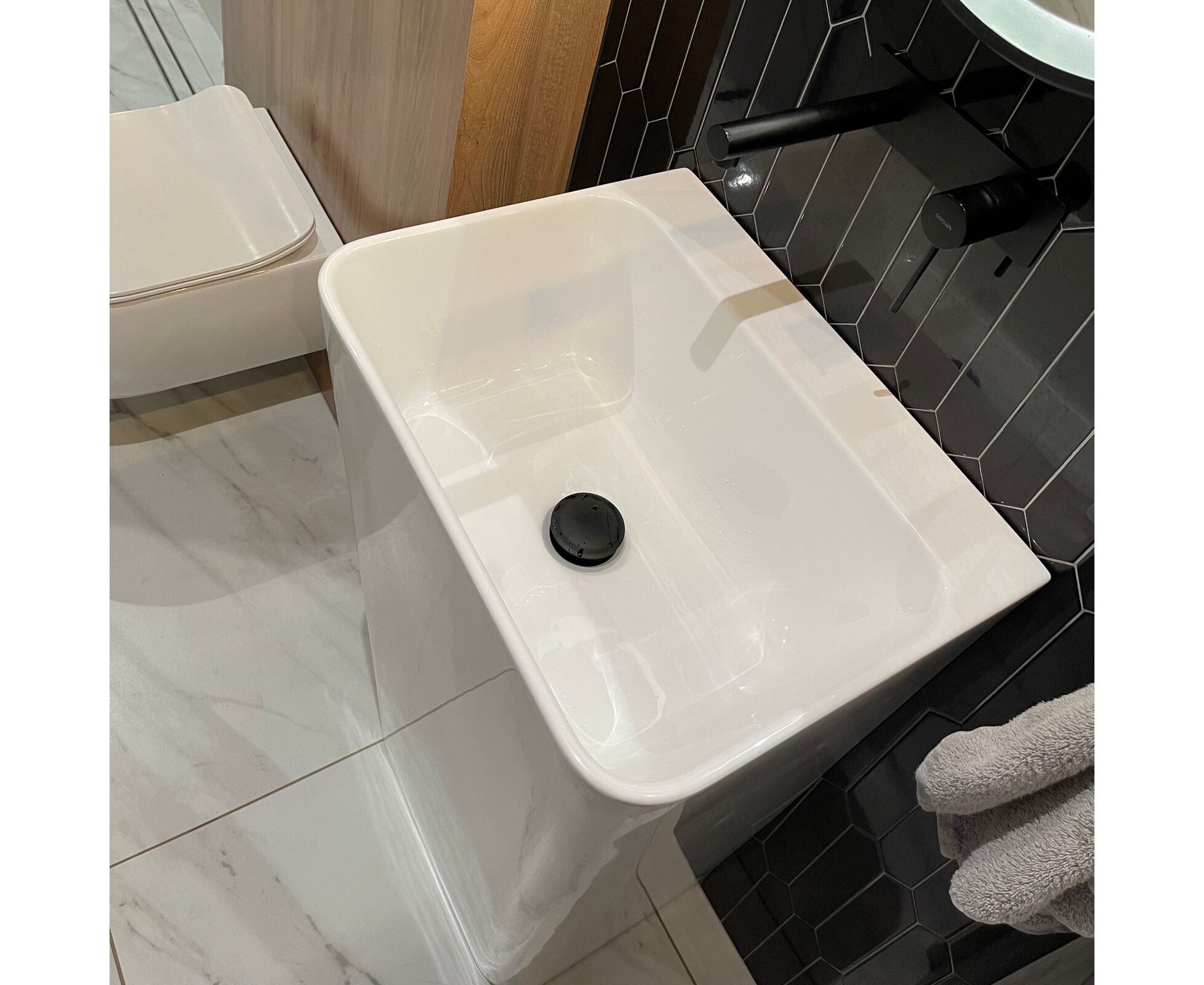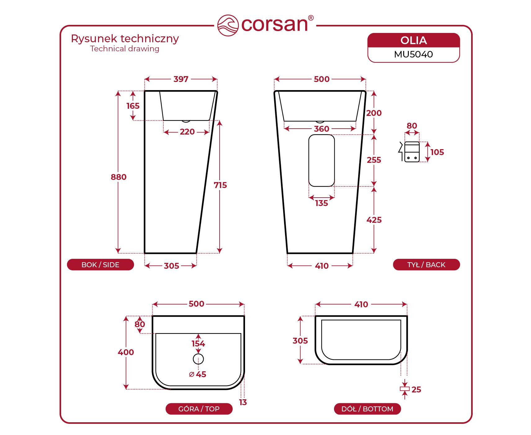 CORSAN MU5040BLS - Stojąca umywalka akrylowa OLIA MU5040BLS z syfonem i czarnym korkiem.
