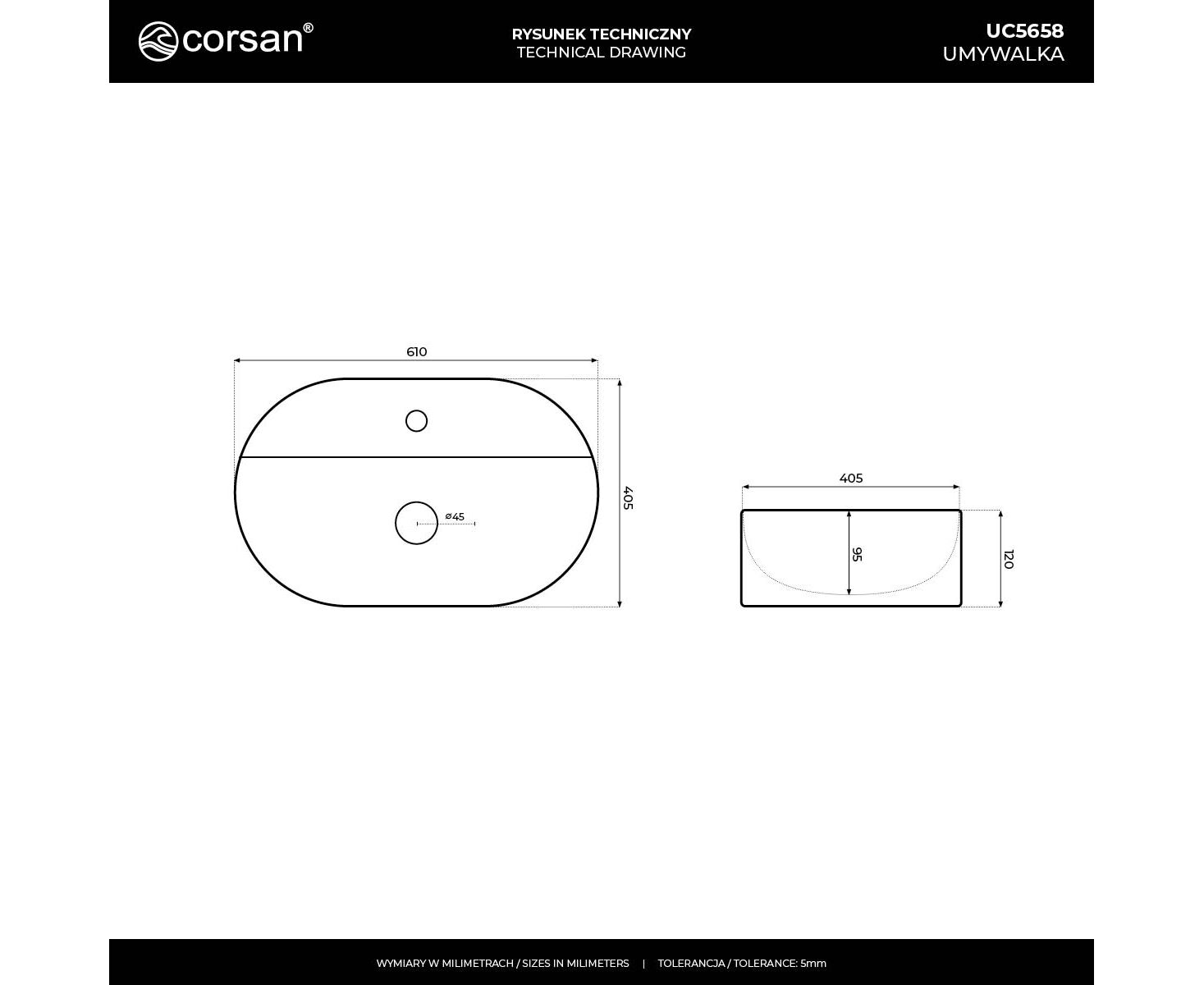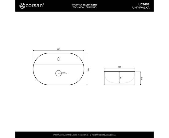 CORSAN UC5658WH - Umywalka nablatowa OLVENA UC5658WH 600x400x120mm Otwór na baterię Biały korek.