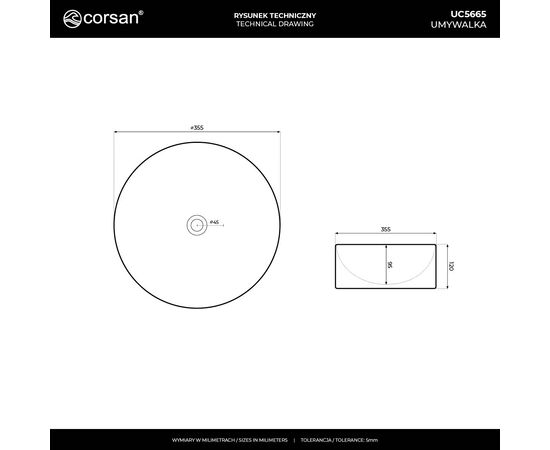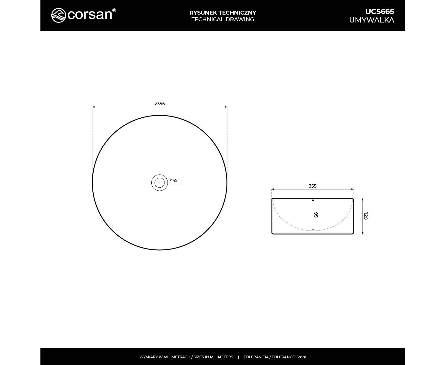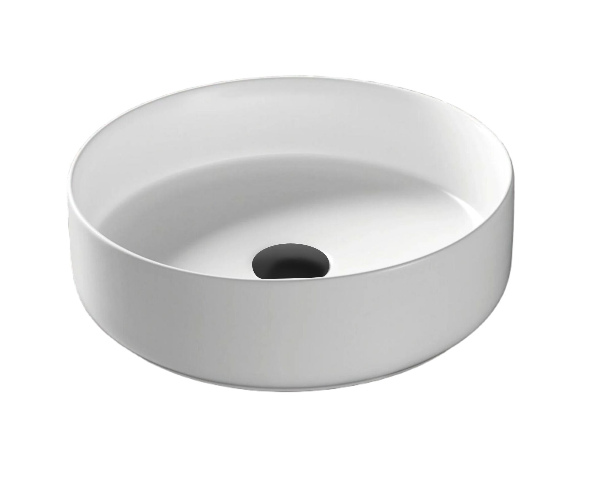 CORSAN UC5665BL - Umywalka nablatowa LUGO UC5665BL okrągła 360x120 mm z korkiem czarnym.