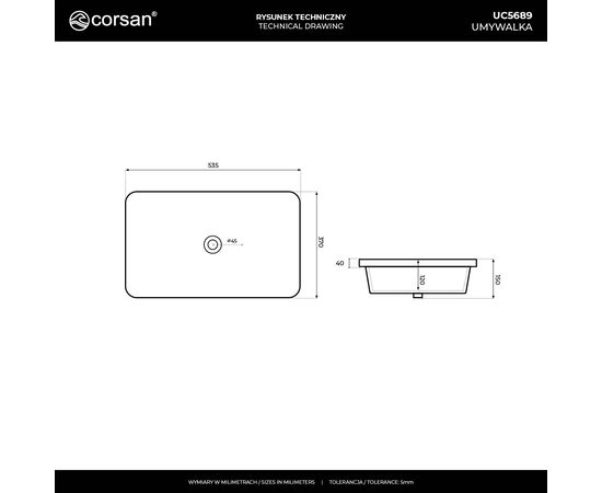 CORSAN UC5689CH - Umywalka wpuszczana w blat INTERO UC5689CH 530x370x155 mm z korkiem chrom.