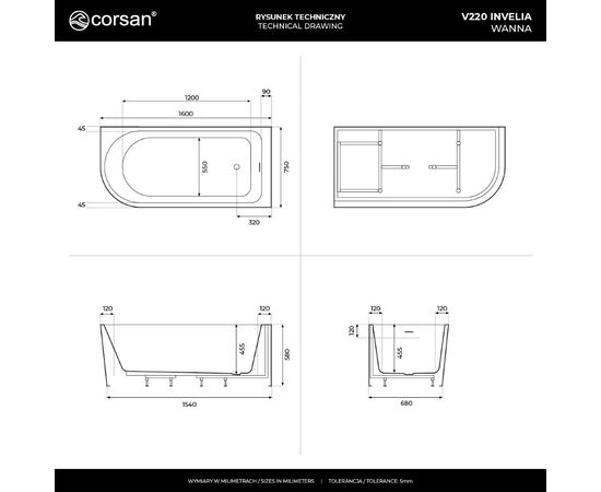 CORSAN V220LLBGL - Wanna narożna INVELIA V220LLBGL 160x75 cm Montaż lewstronny Przelew szczelinowy Korek klik klak Złoto szczotkowane.