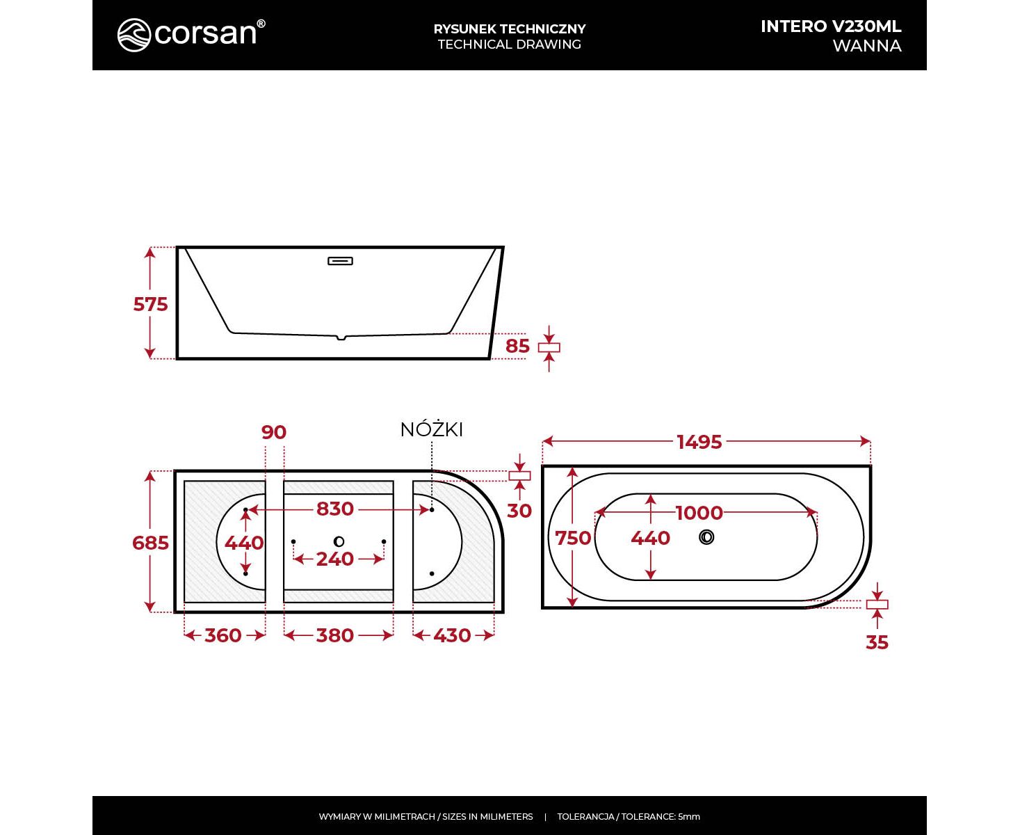 • Tolerancja wymiarów: +/- 5 mm