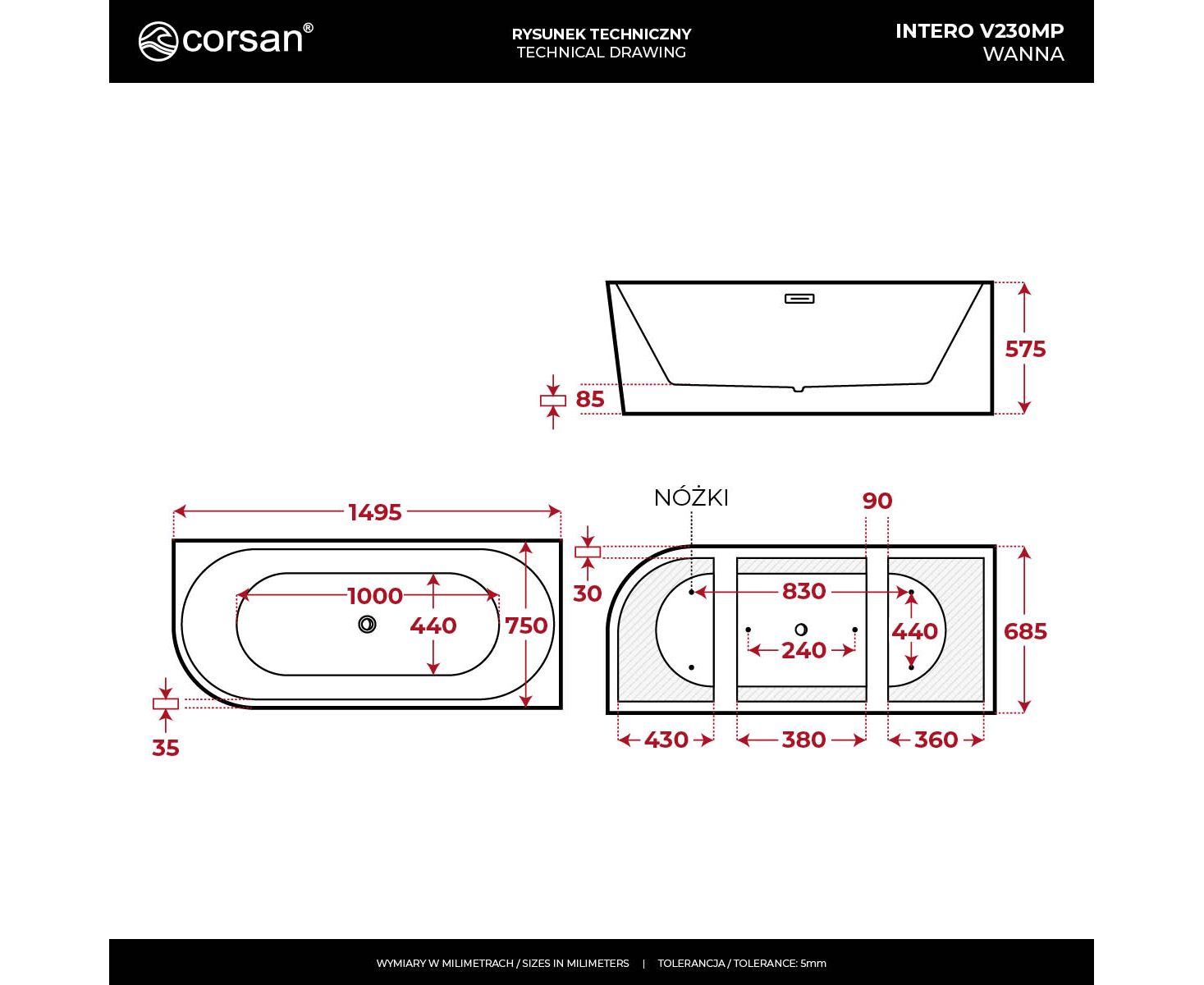 - Montaż wanny: Prawostronny