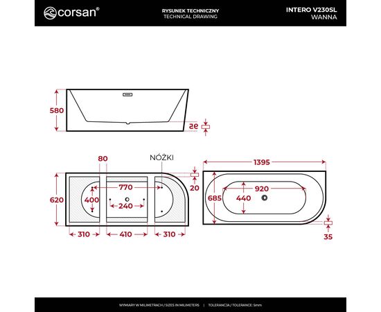 CORSAN V230SLBL - Wanna narożna INTERO V230SLBL 140 cm Montaż lewostronny Przelew szczelinowy Korek klik klak Czarny.