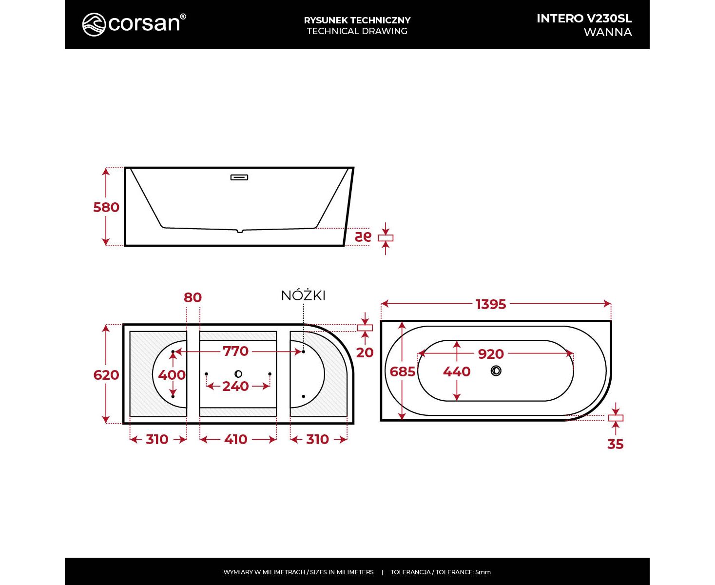 CORSAN V230SLWH - Wanna narożna INTERO V230SLWH 140 cm Montaż lewostronny Przelew szczelinowy Korek klik klak Biały.