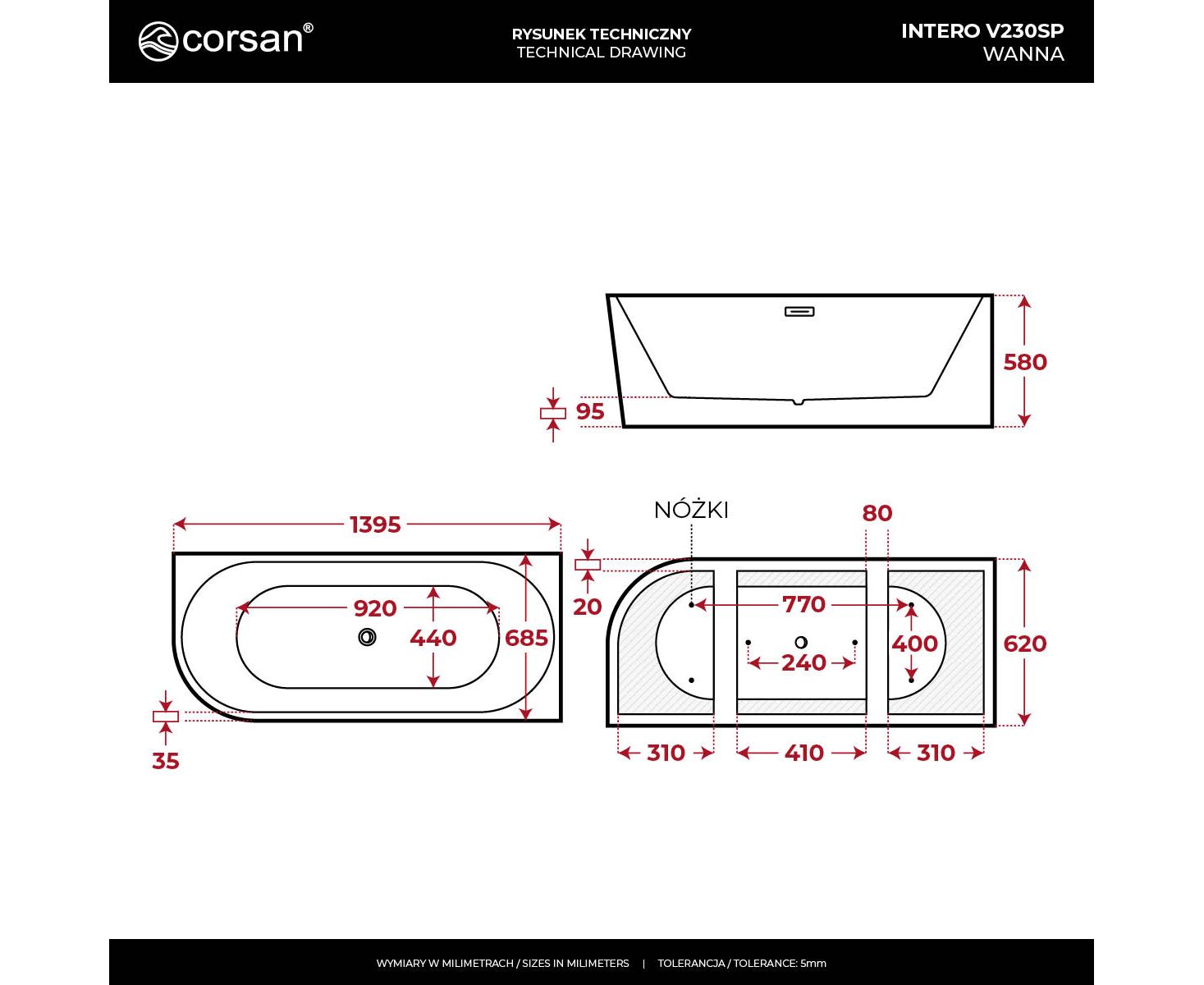 • Tolerancja wymiarów: +/- 5 mm