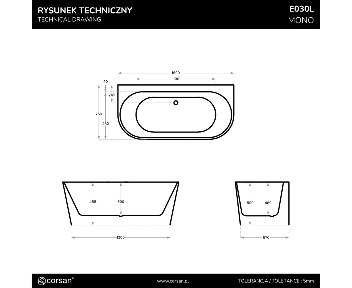 - Wysokość wanny: 60 cm