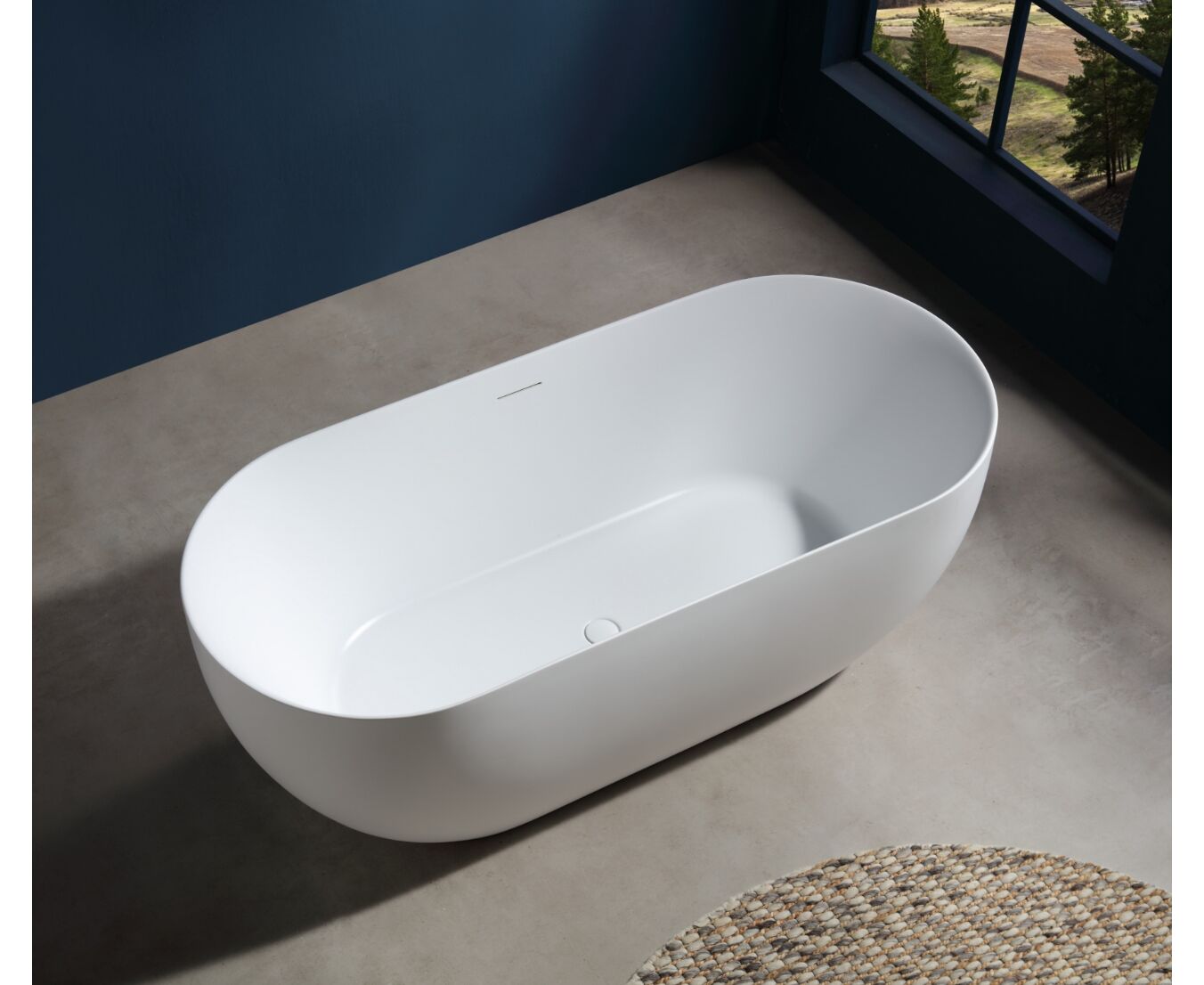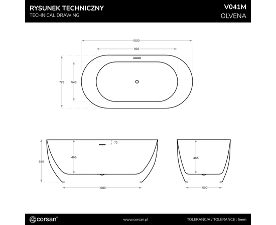 CORSAN V041MWH - Wanna wolnostojąca OLVENA V041MWH 150 cm Przelew szczelinowy Korek klik-klak Biały.